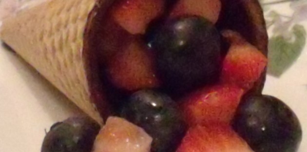 Microwave the chocolate chips in a microwave safe bowl for one minute or until melted. Stir until smooth. Using a butter knife, carefully spread the chocolate inside and on the top edge of the cone. Put the cone in a cup to keep it upright. Refrigerate cone for five minutes or until chocolate hardens. Rinse fruit. Hull strawberry and chop into pieces about the same size as the blueberries. Fill cone with fruit.