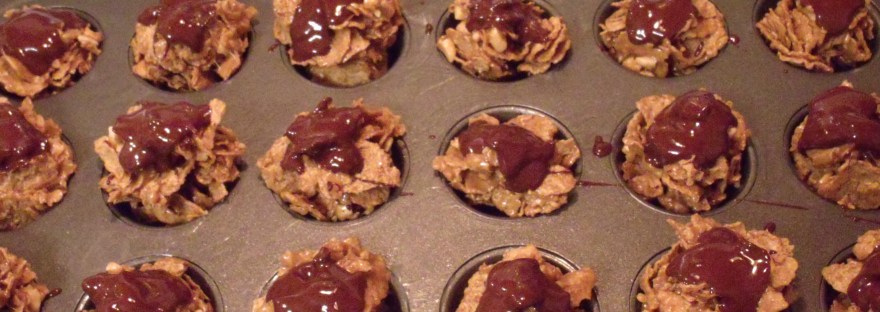 Brush butter in 24 mini muffin cups. Put nuts in a plastic bag. Hit nuts with the back of a spoon to break them into small pieces. Mix nuts with cereal. In a saucepan, bring corn syrup, brown sugar, and peanut butter to a boil stirring constantly. Boil for one minute stirring constantly. Combine boiled mixture with cereal and nuts. When mixture is cool enough to handle, make mounds with buttered fingers in each muffin cup. Work quickly to complete mounds before mixture cools and hardens. Microwave chocolate chips for one minute or until melted. Stir until smooth. Spoon a small amount of chocolate over each mound. Put muffin tin in the freezer for five minutes or until chocolate hardens. Remove mounds from tin and store in an airtight container.