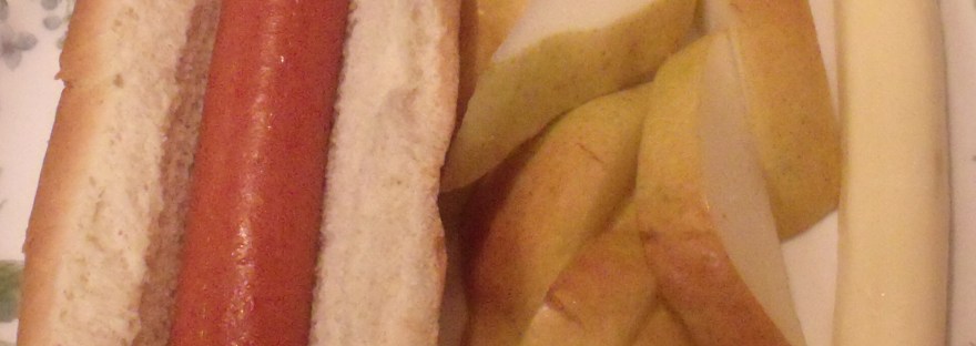 Microwave hot dog according to package directions. Place hot dog in a bun. Rinse and slice pear. Take string cheese stick out of the wrapper. Have with a glass of water.