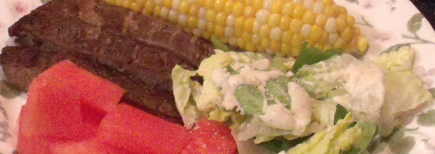 The night before eating the steak, place it in a container and pour the vegetable oil over the top of it. Sprinkle half of the Italian salad dressing mix on one side of the steak. Turn and sprinkle the other side with the rest of the dressing mix. Turn a few more times to coat thoroughly. Cover and put in the refrigerator to marinate. When you are ready to cook the steak, place it on a broiler pan and broil on high. Turn it over a few times while broiling. I like my meat well done, which took approximately 45 minutes. Peel corn and put it in a pan of water. Cover and bring water to a boil. Boil corn for 10 minutes or until tender. Drain. Pour butter over corn and turn cobs to coat. Lightly drizzle salad with Caesar dressing and sprinkle with Parmesan cheese. Serve with watermelon. Have with a glass of water.