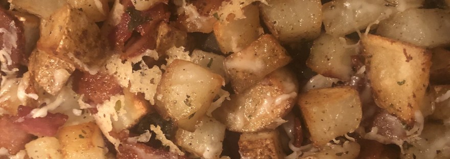 Wash, peel, and dice potatoes. Cook bacon to desired crispiness in a 12-inch skillet over medium-high heat. Remove bacon from the pan. Add butter to the bacon drippings in the pan. When butter is melted, carefully add potatoes and cook until golden brown on all sides. Crumble bacon and put back in the pan with the potatoes. Stir in spices.  Remove from heat and immediately sprinkle with cheese. Have with a glass of water.