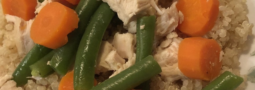 Preheat oven to 450 degrees. Coat chicken breast with oil. Place chicken on a foil lined pan and season with pepper. Bake for 25 to 30 minutes or until chicken is no longer pink and juices run clear. Cut into bite-sized pieces. Put quinoa in a fine-mesh strainer and rinse with cold water until water runs clear. Drain. Bring water to a boil. Add quinoa. Stir and reduce heat to low. Cover and cook for 12 to 16 minutes or until water is absorbed. Fluff quinoa with a fork. Bring chicken broth to a boil. Add carrots, green beans, and garlic powder. Cook on medium-high heat for 7 minutes or until carrots are tender-crisp. Stir in chicken. Serve chicken and vegetable mixture over quinoa. Have with a serving of milk or a glass of water.