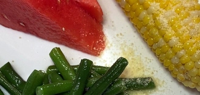 Peel corn and cook in a covered pot of boiling water for 10 minutes or until tender. Drain. Snap ends off green beans and break beans in half. Cook beans in boiling water for 7 minutes. Drain. Mix butter, pepper, and garlic powder together. Bush garlic butter on corn. Mix remaining garlic butter and beans together. Sprinkle corn and beans with cheese.